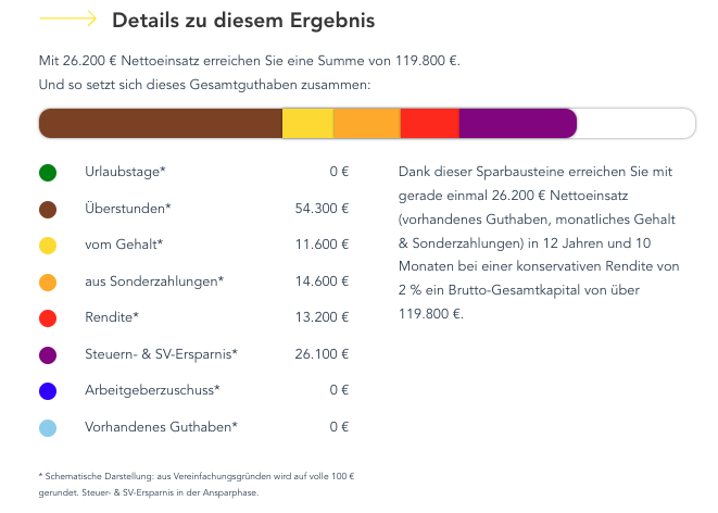 Trotz moderater monatlicher Belastung wird das Ziel erreicht. Das angesparte Zeitwertguthaben reicht aus, um den gewünschten Vorruhestand ab 63 finanziell abzusichern. Dabei wirken mehrere Effekte zusammen: die Einbringung von Überstunden, die steuer- und sozialversicherungsoptimierte Ansparphase sowie die kapitalgedeckte Anlage des Guthabens.