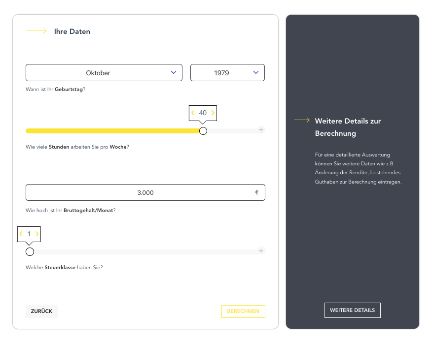 Alter, Arbeitszeit, Bruttogehalt und Steuerklasse bilden die rechnerische Grundlage. Sie bestimmen, wie lange angespart werden kann und wie sich steuerliche Effekte auswirken.